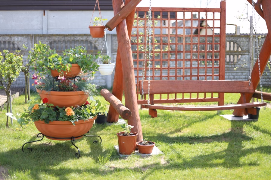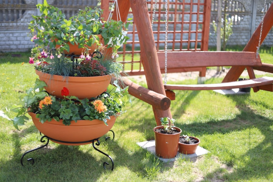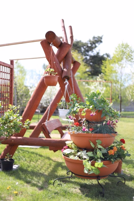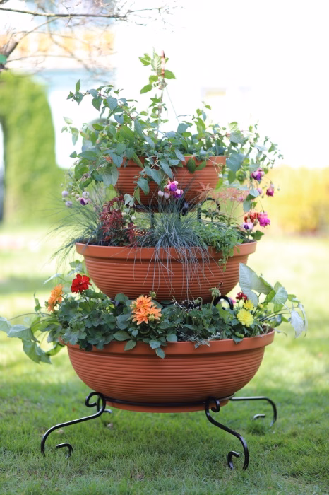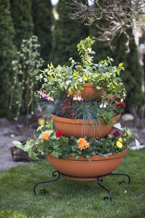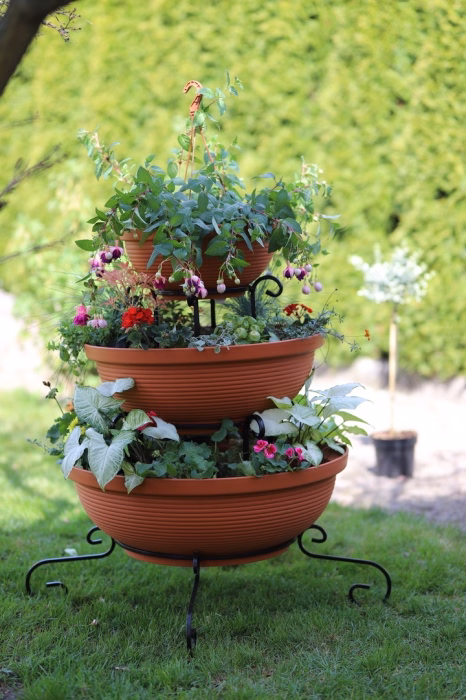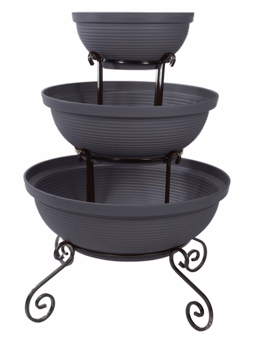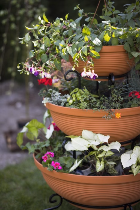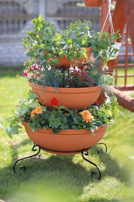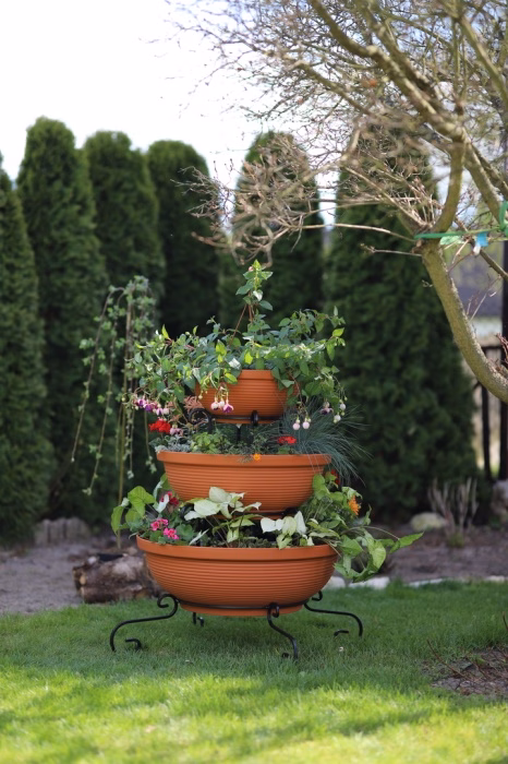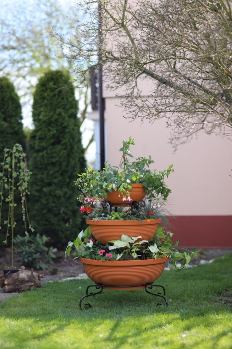Gartenausstattung / Gartenmöbel / Gartenblumenständer - Blumenständer Metall Wasserfall 3 Töpfe Träumen Sie von einem spektakulären Look für Ihren Garten oder Ihre Terrasse? Wählen Sie ein modernes Blumenbeet aus dem Versanis-Onlineshop. Es besteht aus drei Töpfen in Schwarz oder Terrakotta, die vom größten bis zum kleinsten auf einem einfachen Rahmen gestapelt sind, der in der zeitlosen Metalltechnik hergestellt wurde. Dieser Ständer ist, wie die anderen Gartenbeete aus dem Versanis-Shop, stabil, langlebig und unempfindlich gegen Regen oder Kratzer. Er ist äußerst vielseitig - er passt zu vielen anderen Elementen der Umgebung. Dies wird auch durch die Möglichkeit erleichtert, die Farbe der Metallstruktur zu wählen. Um den besten Effekt zu erzielen, ist es ratsam, hängende Pflanzen in die Töpfe zu pflanzen, die von oben herabfallen und das Auge von Gästen und Hausbewohnern erfreuen werden.