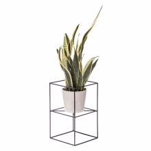 Metallischer, minimalistischer freistehender Pflanzenständer mit zwei Regalen..