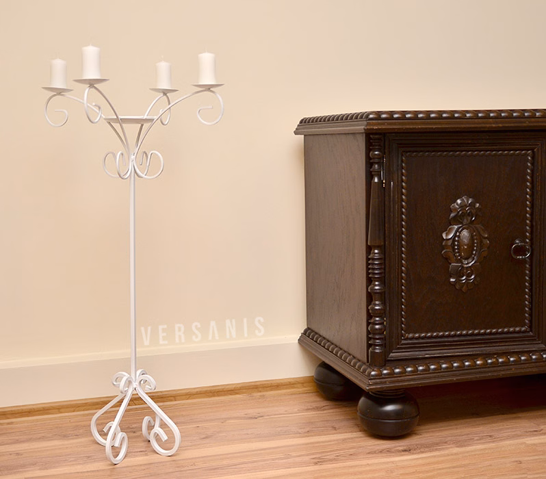 Innendekorationen / Kerzenständer - Dekorativer stehender Kerzenhalter Manchmal kann ein einziges dekoratives Element mehr ausdrücken als tausend Worte. Ein solches Accessoire ist ein Kerzenständer. Natürlich gibt es viele verschiedene Modelle, aber eines davon eignet sich sehr gut für die Dekoration von Hochzeitssälen oder Kirchen. Er verleiht diesen Orten eine tolle Atmosphäre! Barocker Kerzenständer Dieses Produkt ist aus Metall und besteht aus vier Kerzenhalterungen. Er ist sehr zart und passt daher perfekt in feminine, romantische Innenräume. Er ist eine schöne Dekoration für jeden Tisch! Schaffen Sie eine wunderbare Atmosphäre Wenn Sie möchten, dass die von Ihnen organisierte Veranstaltung - sei es eine Hochzeit oder ein Firmenmeeting - in einem schönen Rahmen stattfindet, sollten Sie vielleicht in einen Kerzenhalter investieren. Und nicht nur einen! Der, den Sie im Versanis-Shop finden, ist ein barockes und kunstvolles Stück, das auch die hartgesottensten Gemüter begeistern wird. Jede Frau, die ihrer Party eine besondere Atmosphäre verleihen möchte, wird sicherlich nicht gleichgültig an ihm vorbeigehen. Seine schönen Metallformen werden die Blicke Ihrer Familie und aller geladenen Gäste auf sich ziehen. Zusätzlich zu seinem schönen Design verfügt er über 4 Kerzenschlitze. Wenn Sie eine wunderbare Atmosphäre für Ihre Party schaffen wollen, dann ist dieses Accessoire genau das Richtige für Sie! Dies ist ein hochwertiges Produkt zu einem sehr erschwinglichen Preis.