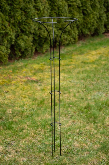 Die Stütze wurde mit einer hochtemperaturhärtenden Pulverfarbe lackiert. Diese Behandlung macht das Produkt witterungsbeständig und damit ideal für Garten- und Kübelpflanzen.