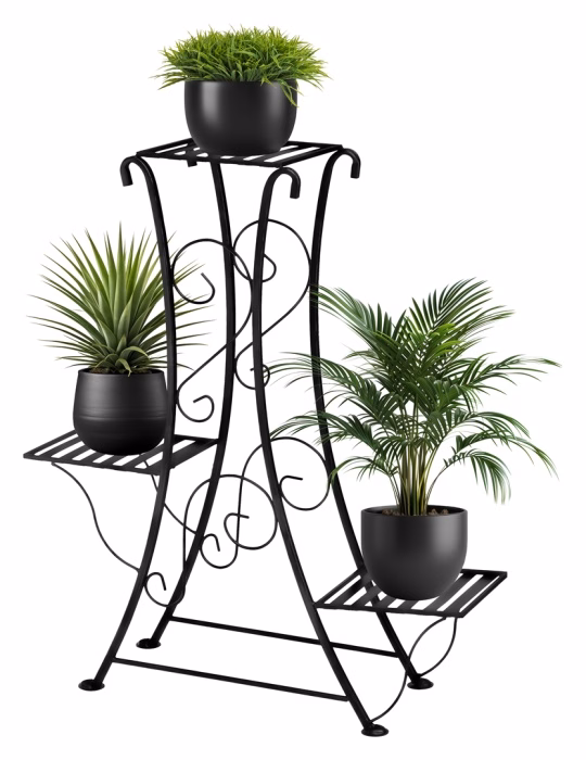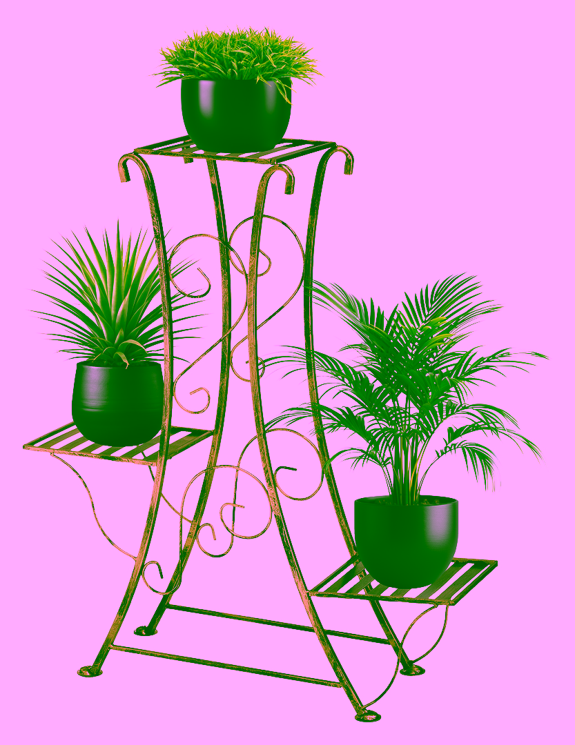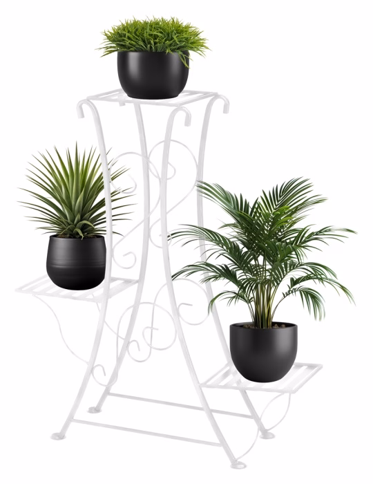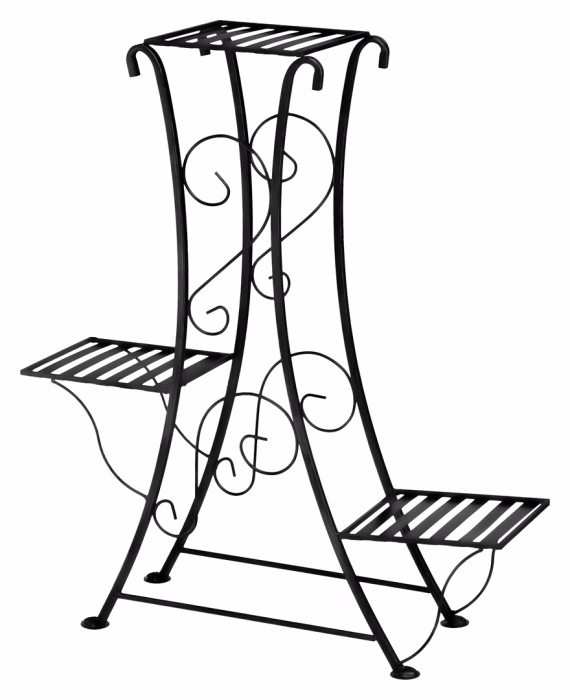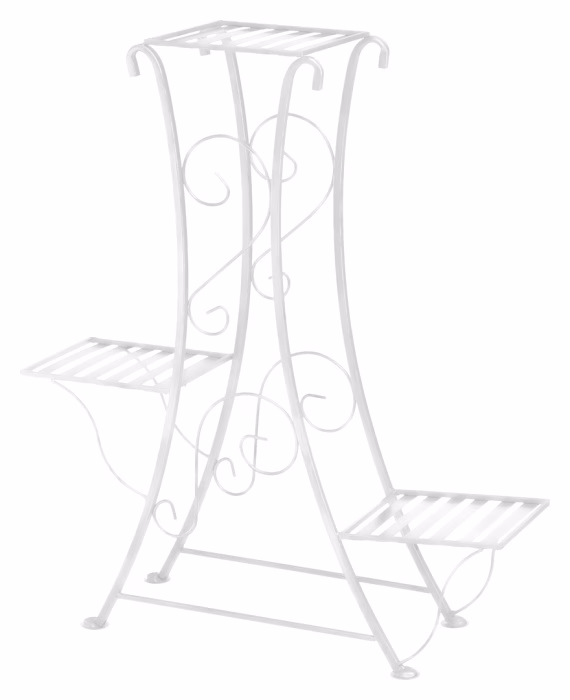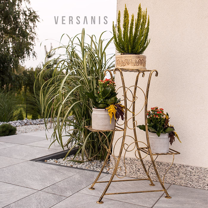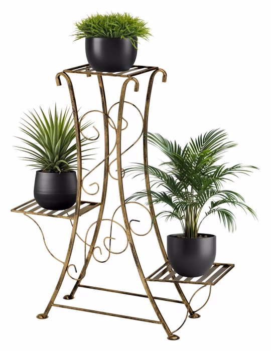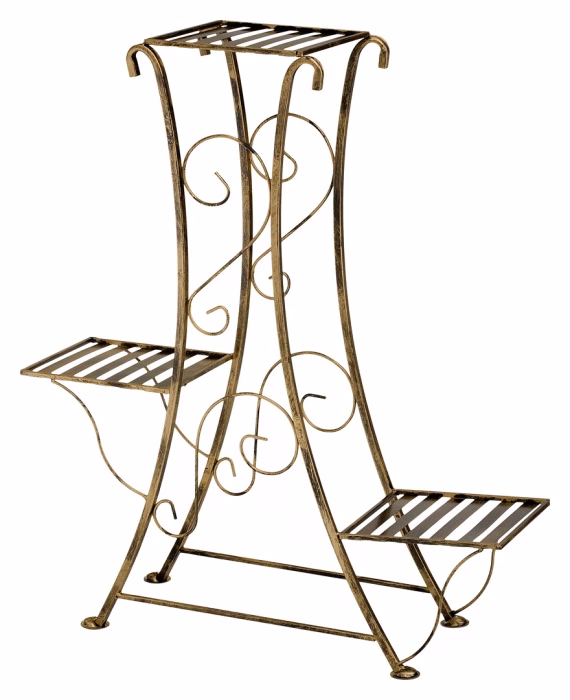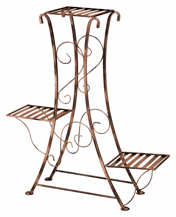 Innendekorationen / Blumenständer / Blumenständer - Metall Blumenständer 3 Flächen Modernität und Stil - das sind zwei Eigenschaften, die das Wesen des vorgestellten Produkts perfekt widerspiegeln. Das Stehbeet ist nicht mehr nur ein Element, das die Schönheit der Pflanzen zur Schau stellt, sondern auch eine elegante Dekoration für jedes Interieur. Es zeichnet sich durch eine so präzise Verarbeitung und charmante Dekoration aus, dass es auch allein, ohne Blumen, eine schöne Dekoration für den Innen- und Außenbereich darstellt. Das Blumenbeet hat ein modernes Design und zieht durch sein reiches Aussehen die Aufmerksamkeit auf sich. Das Blumenbeet ist zusätzlich mit stilvollen Mustern verziert, die die Seiten des Produkts schmücken. Das Gesamtbild ist sehr exklusiv. Die Struktur sorgt für eine interessante Anordnung der Pflanzen, wodurch das Produkt noch mehr an ästhetischem Wert gewinnt. Es wurde aus Metall höchster Qualität hergestellt, wodurch es Stabilität und Haltbarkeit garantiert. In Kombination mit Blumen wird er eine schöne Komposition für viele Jahre bilden. Er eignet sich perfekt als Dekoration für den Innenraum, aber auch um eine unbeschwerte Atmosphäre in jeden Garten zu bringen.