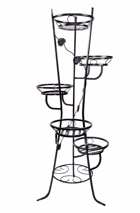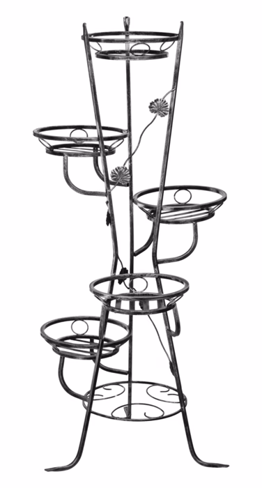 Innendekorationen / Blumenständer / Blumenständer Schmiedeeisen Hoch - Metall Blumenständer 5 Ebenen Der Blumenständer aus dem Versanis-Onlineshop hat einerseits einen sehr romantischen und andererseits einen sehr modernen Charakter. Er passt zu einer Terrasse im Jugendstil ebenso wie zu einem minimalistischen Arrangement. Gefertigt in der immer modischen Metalltechnik und verziert mit Blattmotiven aus geschmiedetem Stahl, besticht es durch seine elegante Erscheinung. Dieses Stehbeet besteht aus fünf robusten und geräumigen Topfhaltern, auf denen wir unsere Lieblingspflanzen präsentieren können, auch solche, die kaskadenartig von oben herabhängen. Die Metallkonstruktion ist äußerst langlebig und widerstandsfähig. Dank der Farbwahl des Metallgestells lässt sich der Ständer problemlos mit anderen Accessoires und Möbeln auf der Terrasse, dem Balkon oder im Garten kombinieren.