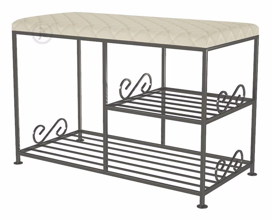 Möbel / Bänke und Sofas / Schuhbänke - Regal im Flur mit Sitzgelegenheit Der Polstersessel aus dem Angebot des Versanis Shops ist ein hochwertiges Möbelstück aus polnischer Produktion. Er ist perfekt für den Flur, Korridor, aber auch für das Badezimmer oder Esszimmer. Er kann als bequeme Fußstütze, als praktische Sitzgelegenheit zum Anziehen der Schuhe oder als Ablage für Handtücher dienen. Das stabile Gestell aus pulverbeschichtetem Metall ist mit geschwungenen Elementen verziert und mit einer weichen, mit Stoff bezogenen Sitzfläche in mehreren Farbvarianten kombiniert. Die praktischen Doppelablagen, von denen eine kleiner und von der anderen getrennt ist, können zur Aufbewahrung von Schuhen und einer Schachtel mit Schuhpflegezubehör genutzt werden. Der elegante Polstersessel ergänzt eine stilisierte Einrichtung, kann aber auch als Akzent in einem modernen Raum eingesetzt werden.