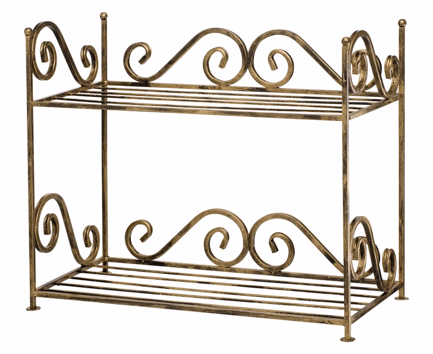 Räume / Wohnzimmer / Schuhregale Regale / Schränke & Sideboards & Highboards - Schuhregal aus Metall Das vorgestellte Produkt ist ein ideales Dekorationselement, das schon am Eingang der Wohnung Eleganz und Stil vermittelt. Es eignet sich perfekt als Dekoration für einen Flur, eine Lobby oder einen Korridor. Der Ständer verfügt über zwei breite Ablagen, auf denen mehrere Paar Schuhe oder kleine Gegenstände wie Hüte, Handschuhe oder Schals untergebracht werden können. Dieses Modell ist aus hochwertigem Metall gefertigt, was eine außergewöhnliche Robustheit garantiert. Die Einlegeböden sind sehr robust und das Regal ist stark und stabil. Neben seinen funktionalen Eigenschaften besitzt das Produkt auch erstklassige ästhetische Qualitäten. Es zeichnet sich durch seine filigrane Optik und präzise Verarbeitung aus. Die dekorativen S-förmigen Dekore, die sowohl den einzigartigen Charakter des Produkts unterstreichen als auch als Schutz für die auf dem Regal platzierten Gegenstände dienen, tragen zu seinem Charme bei. Entscheiden Sie sich für Stil und Eleganz ab dem Moment, in dem Sie die Schwelle Ihres Hauses überschreiten. Das Schuhregal mit seinen exquisiten Ornamenten wird das wichtigste Dekorationselement in jedem Vorraum, Flur oder Eingangsbereich sein. Es wird Gäste und Familie gleichermaßen verzaubern!