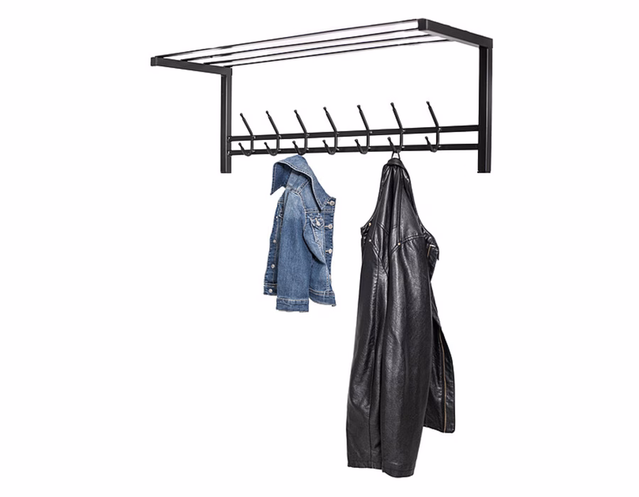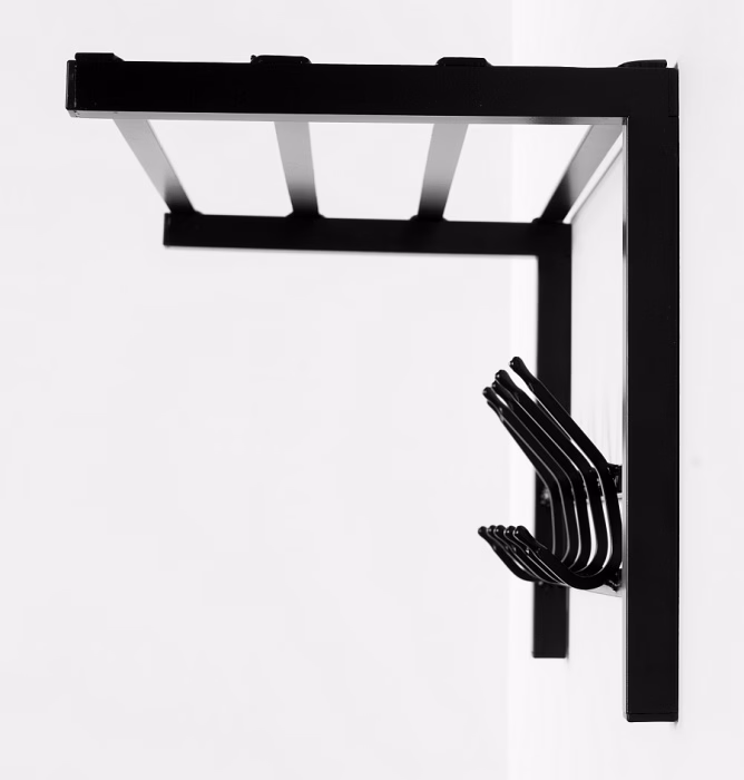 Räume / Flur & Diele / Garderoben / Garderobenleisten / Garderoben mit Hutablage - Wandaufhänger mit Ablage - 70 cm. In einer kleinen Diele zählt jeder Zentimeter Platz. Clevere Möbel wie der Versanis Regalaufhänger helfen, ihn perfekt zu organisieren. Er hängt genau in der richtigen Höhe an der Wand und ermöglicht es Ihnen, Ihre Oberbekleidung frei an den Metallhaken aufzuhängen und Kleinigkeiten wie Handschuhe, Mützen und Schals auf der praktischen und geräumigen Ablage abzulegen. Dieses stilvolle und doch äußerst robuste Design wirkt elegant und leicht. Metallarbeiten kommen nie aus der Mode und ermöglichen viele Kombinationen mit rustikalen Holzmöbeln und modernen, glasierten Möbeln. Die Farbe der Profile kann den eigenen Vorlieben angepasst werden und verfeinert die Einrichtung des Flurs bis ins Detail.