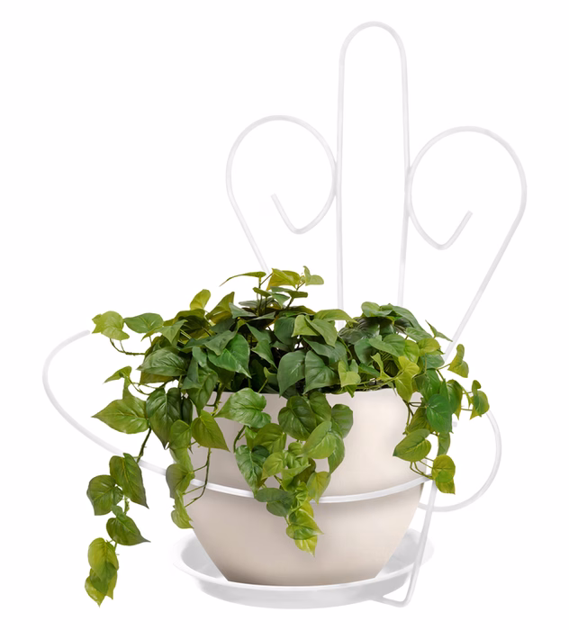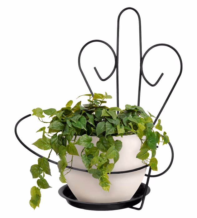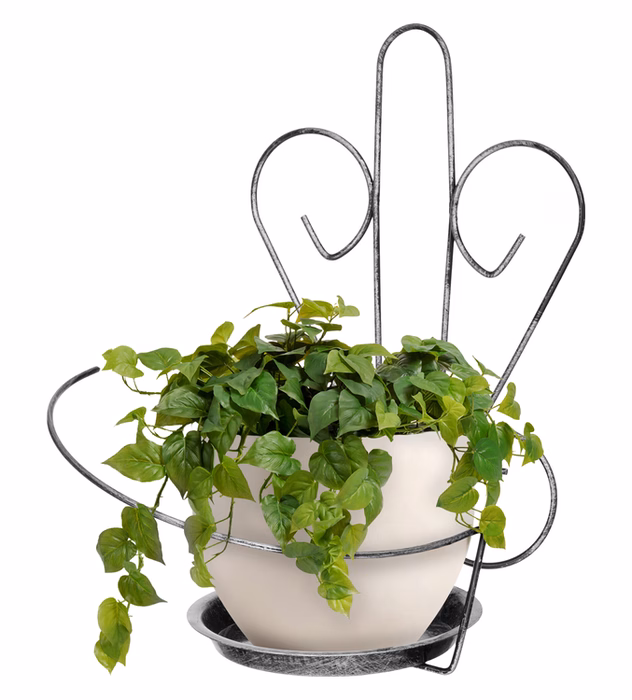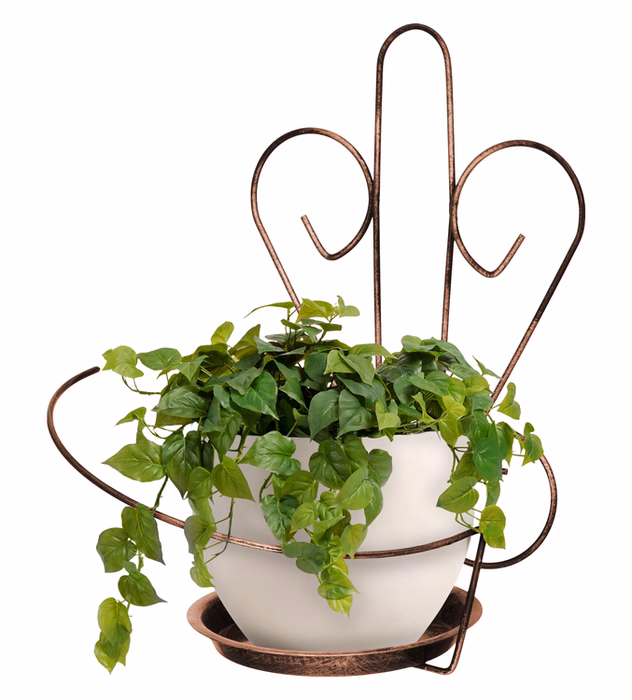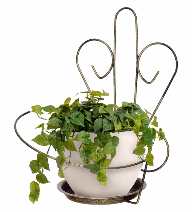 Innendekorationen / Blumenständer / Wandampel - Wandhalterung für Blumenampel Das Wandblumenbeet aus Metall ist eine elegante Ergänzung für viele Räume, vom Büroflur über das Schlafzimmer bis hin zur Terrasse oder dem Balkon, und besteht aus einem Metallsockel und einem aus Draht gebogenen Hintergrund in Form einer ornamentalen Jugendstilpalmette. Hängende Blumen, aber auch Farne oder Sukkulenten sehen in einem solchen Beet spektakulär aus. Das Wandblumenbeet wurde von der Ästhetik des Art déco inspiriert, passt aber auch zu rohen, minimalistischen und romantischen Möbeln und anderen Accessoires. Wenn Sie Ihre Inneneinrichtung damit ergänzen, scheuen Sie sich nicht, überraschende, eklektische Kombinationen zu schaffen, die seit langem in Mode sind. Die leichte Konstruktion dieses Blumenregals verursacht keine Probleme bei der Montage an der Wand.