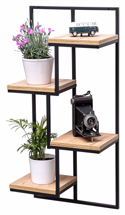 Der Pflanzentopf besticht durch die Kombination eines Stahlrahmens in klassischem Schwarz und natürlichen Holzregalen, die einen einzigartigen Kontrast bilden. Der Metallrahmen sorgt für Stabilität und Langlebigkeit der gesamten Konstruktion, während das Holz der Regalflächen einen warmen und organischen Charakter verleiht. Das Regal hat ein modernes Aussehen, doch der rustikale Stil passt hervorragend zu loftartigen, rustikalen und skandinavischen Interieurs.